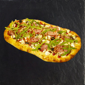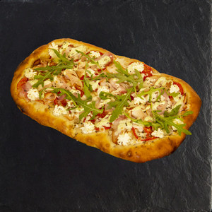 Филе птицы, бекон, томаты свежие, сыр Моцарелла, сыр творожный, соус Ранч, рукола, специи.